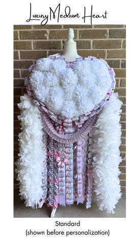 For those who want to go all out for their senior homecoming mum....more draped braids, more diamond dust, more custom designs, more bling, more premium ribbon & braids, more cut-outs, and a standard turkey boa to complete the look. The luxury mum is where you will find all the glamour and customization in one package including all the senior mum custom color combinations, custom shapes & extra-large mega size mums. These larger flower head mums include a custom dressed bear with eyelashes AND monogram or cut-out as standard with options to add even more customization. You dream it, we create it! Reserve your luxury mum now as orders close July 1st of each year.